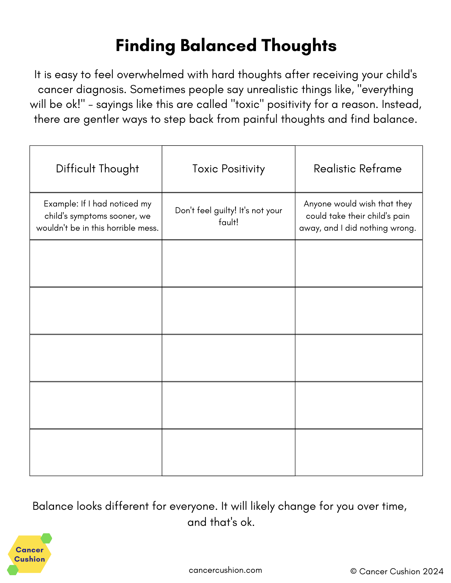 It can be hard to find balance between "worst case scenarios" and "toxic positivity." This worksheet provides structure to handling tough thoughts in a way that's empowering and realistic.