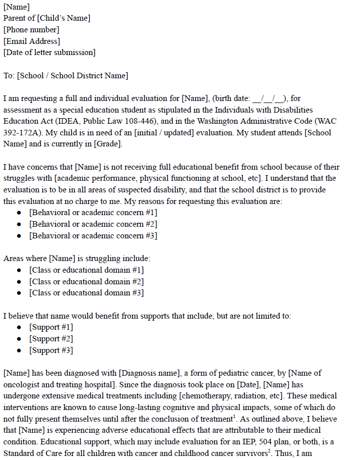 Once the school receives a written request for an evaluation, the request may or may not be accepted. Teachers and other school personnel may be asked to provide input regarding the request, and an evaluation may not proceed if there is not sufficient evidence that a student's education is adversely impacted by their cancer diagnosis or treatment. The school must make a decision on whether to evaluate a student within 25 school days of receiving the request. To ensure compliance with this timeline, it is recommended to include the date of submission on the letter and keep a copy for your records.