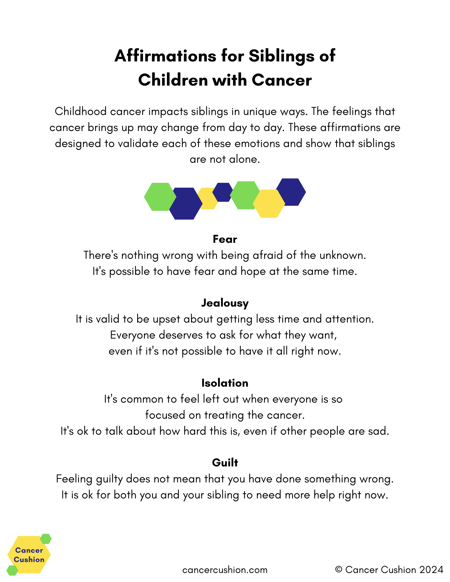 Teens are particularly vulnerable to the emotional strain of their sibling's cancer diagnosis, and they may feel pressure to avoid voicing their feelings. These Affirmations for Siblings name and normalize many common reactions to this experience.